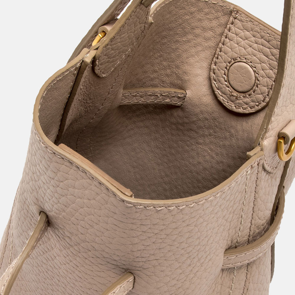 Made in Italy by designer Gianni Chiarini, this super soft bucket bag is crafted from premium Italian maxi grain double leather in a soft and feminine silhouette. With a single inner compartment and magnetic clasp closure, this bag is finished with contrast stitching and can be worn as a handbag, or on the shoulder with the adjustable strap.