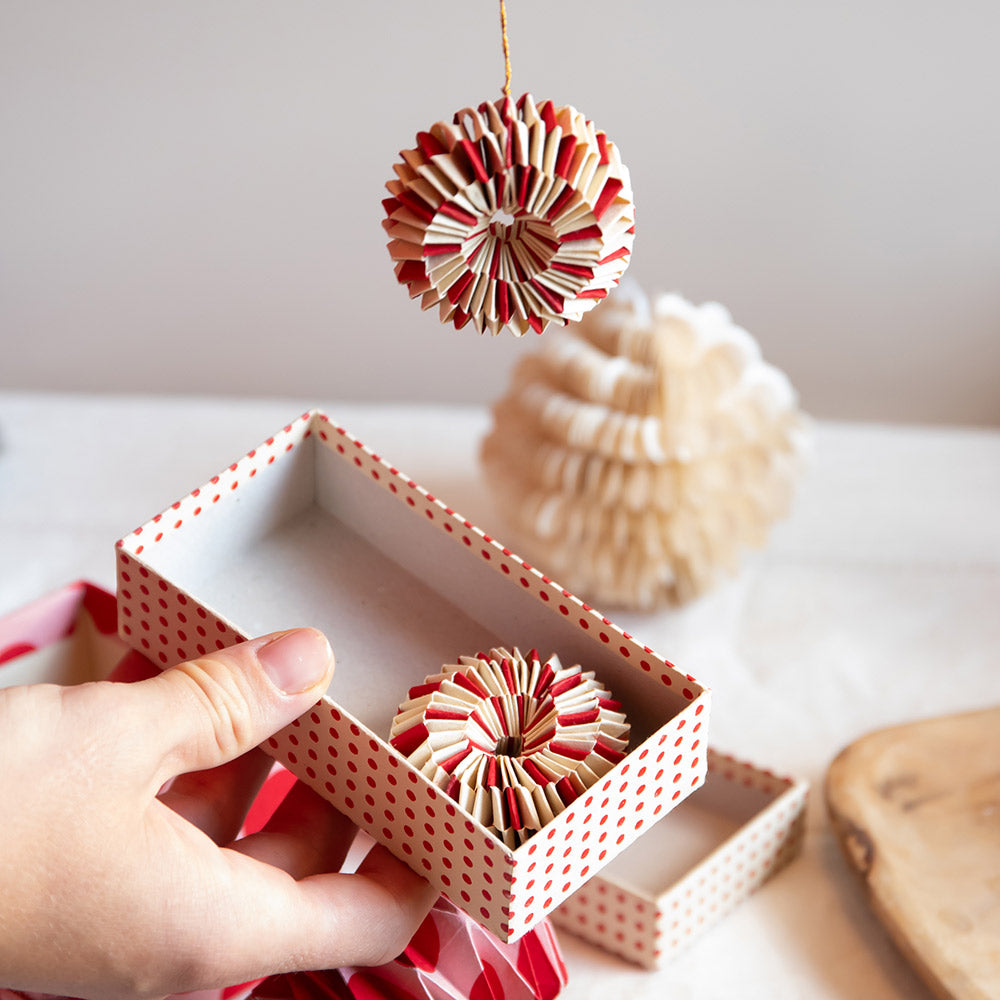 Add some festive elegance to your Christmas tree décor this year with this gorgeous set of 2 paper wheel hanging decorations. Presented in a red spotty box to keep them safely stored, these delicate decorations are hand crafted in Nepal from Lokta paper.