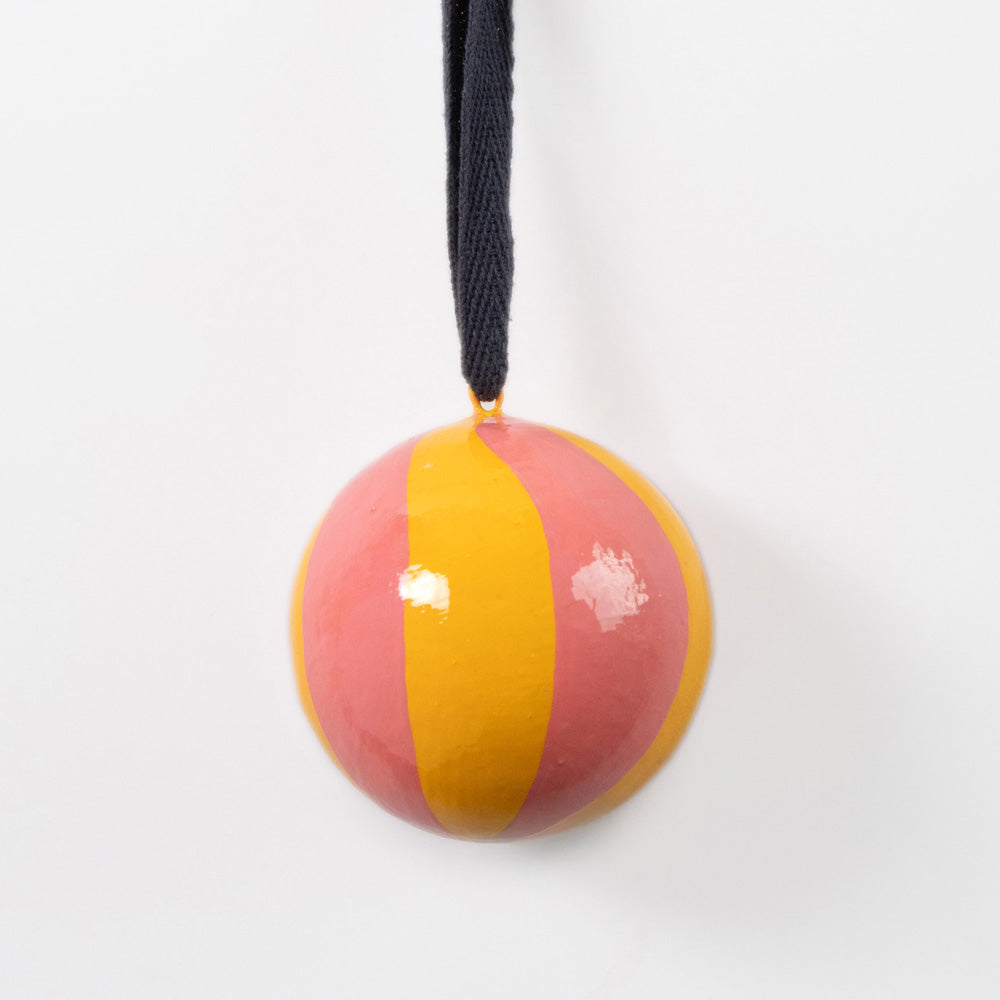 Hang a bit of nostalgia of your tree with this beautiful pink & yellow candy striped swirl bauble. Inspired by a love of vintage fairground design and colour this handmade hanging decoration is crafted in Kashmir, India from papier-mâché using recycled paper.