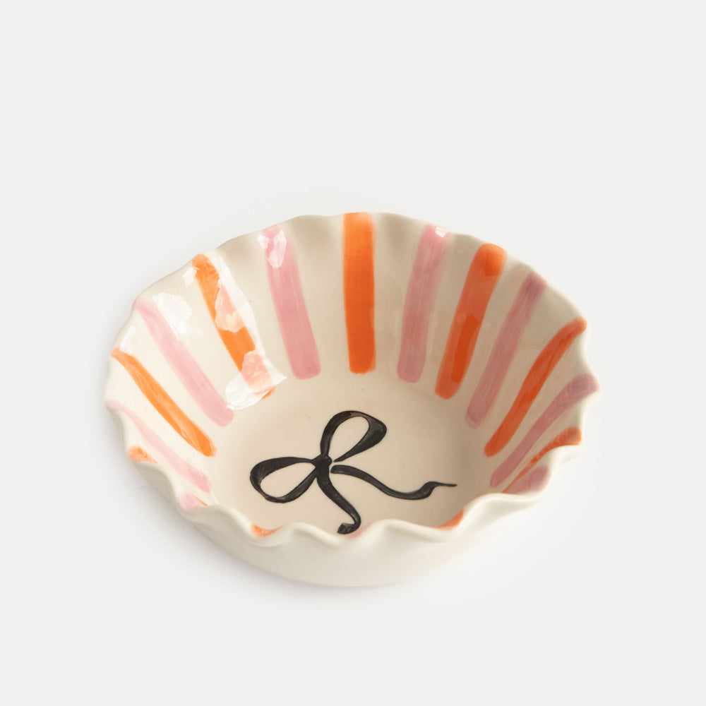 Add a touch of character to everyday dining with our new pink and orange striped bowl. With its scalloped edge and black bow design inside, this bowl is perfect for everything from breakfast berries to evening nibbles.