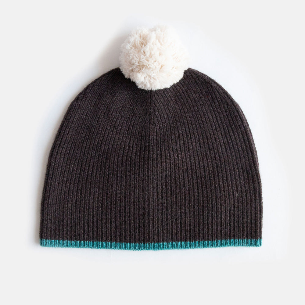 Keep cosy & warm on those cold winter nights with our new pom pom beanie hat. Crafted from pure lightweight cashmere wool in a dark brown fine rib knit and finished with a teal trim and a pearl white pom, this hat is a slightly more spacious fit than our traditional designs. Pair with our dark brown cashmere gloves to complete the look.