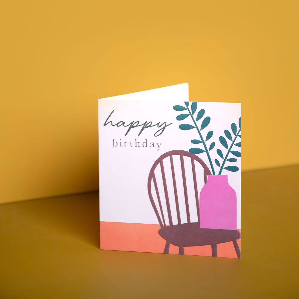 Part of our new Colour Block range this colourful vase on a chair happy birthday card features embossing and gold foil finish for that extra special touch.