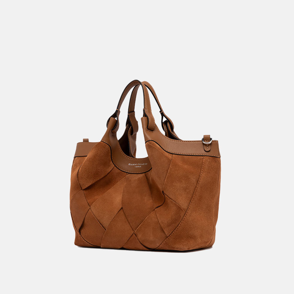 Made in Italy by designer Gianni Chiarini the Dua bag has been updated for 2026 in a stunning chamois geometric weave with tonal leather trim. This stylish bag features a canvas lined internal compartment and comes with two matching leather grab handles and a magnetic clasp closure, as well as a removable & adjustable leather strap so it can be worn as a handbag or across the body.