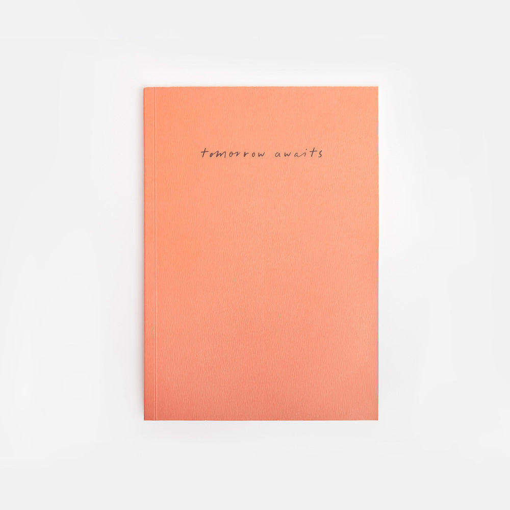 Add a pop of colour to your stationery stash with our orange A5 notebook. The matt soft cover is finished with the text 'tomorrow awaits' and inside you will find 192 pages of 80gsm lined paper, each with a blank date section at the top.
