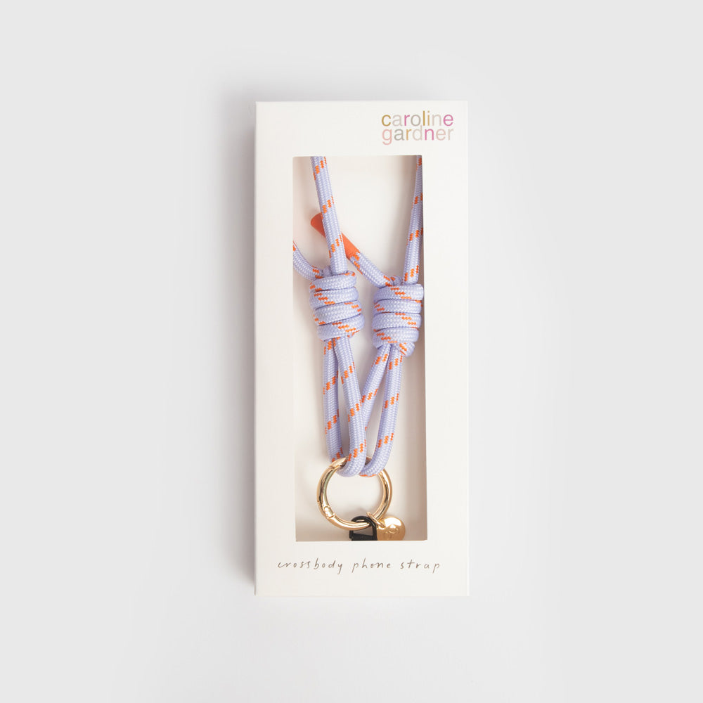 Secure you phone in style with our new long phone strap. Constructed from a durable cord in lilac & orange, this strap is adjustable and can be over the shoulder or crossbody, and comes with a universal d-ring adapter, allowing it to be attached to any phone case.