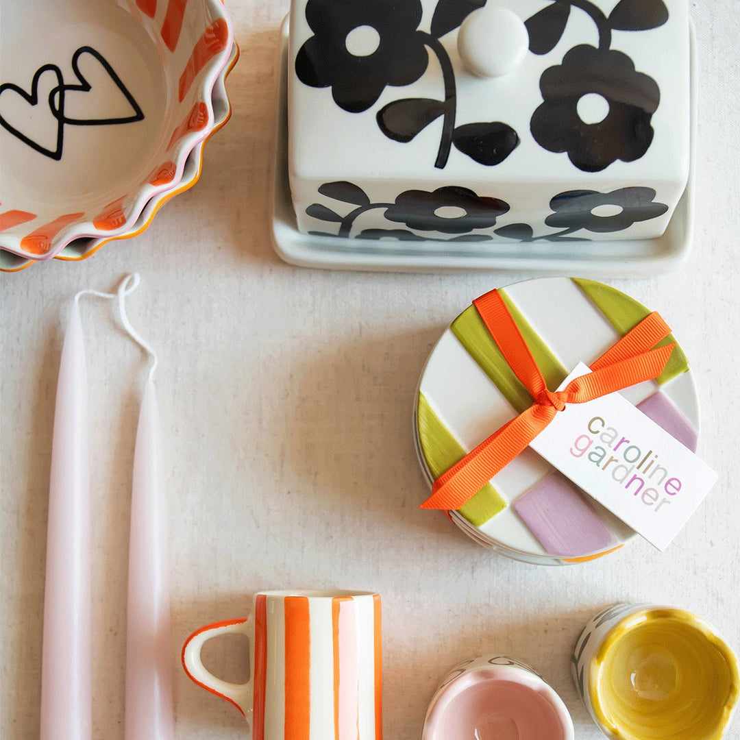 Thirty years later, Caroline Gardner is about much more than cards. While we still prioritise thoughtfulness, kindness, and exceptional quality, our range has expanded to include hand ainted ceramics, stylish accessories, loungewear and more. All of Caroline’s designs showcase her distinctive use of colour, along with her signature heart and floral prints.